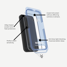 Protect your iPhone screen in an instant with our innovative screen protector installation frame second generation. Within just 15 seconds, you'll effortlessly apply the new protector to your phone, without the hassle of dust or annoying air bubbles. Our iPhone screen protector is not only quick to install, but also offers exceptional protection: it is waterproof, finger proof, scratch-resistant and heat-resistant. Whether you carry your phone in your pocket, are at the beach or braving the summer heat, your screen will stay like new.
